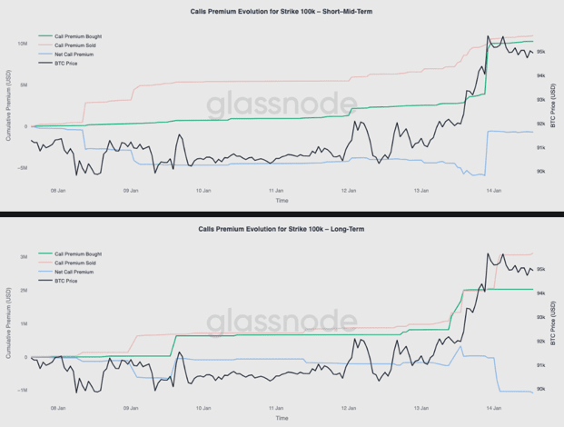 Der untenstehende Glassnode-Chart zeigt, dass die Optionsflüsse um den 100.000-US-Dollar-Niveau darauf hindeuten, dass Händler mehr Call-Optionen kaufen als verkaufen. Dies treibt die Call-Prämien nach oben und zeigt ein starkes Nachfrage nach Aufwärtsexposition im kurzfristigen Zeitraum.
