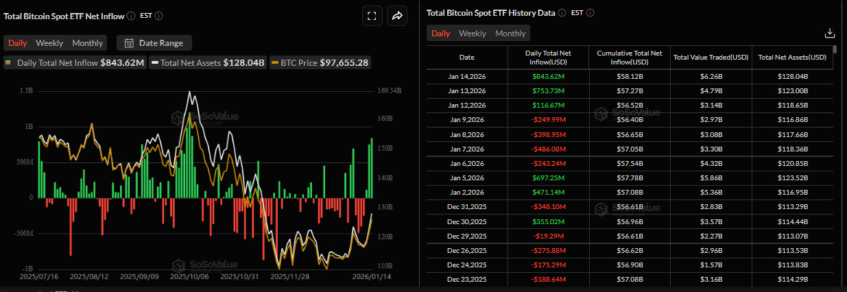 Die institutionelle Nachfrage bleibt weiterhin stark. Daten von SoSoValue zeigen, dass die Spot-ETFs von Bitcoin am Mittwoch Flüsse in Höhe von 843,62 Millionen US-Dollar verzeichneten – der höchste tägliche Fluss seit dem 6. Oktober – was den dritten Tag in Folge positiver Flüsse darstellt. Wenn diese Flüsse anhalten, könnte der anhaltende Anstieg des Bitcoin weitergeführt werden.