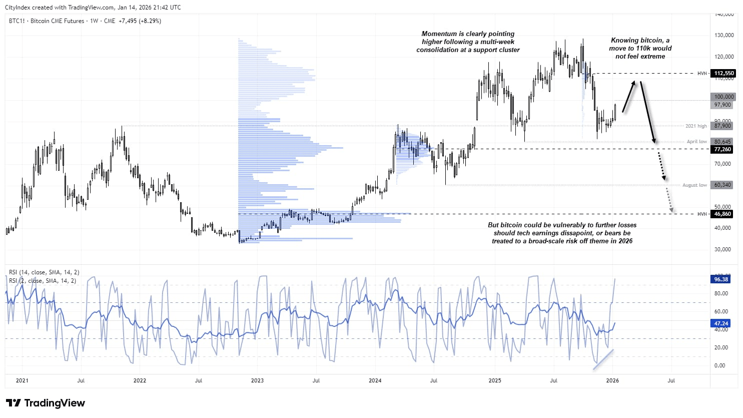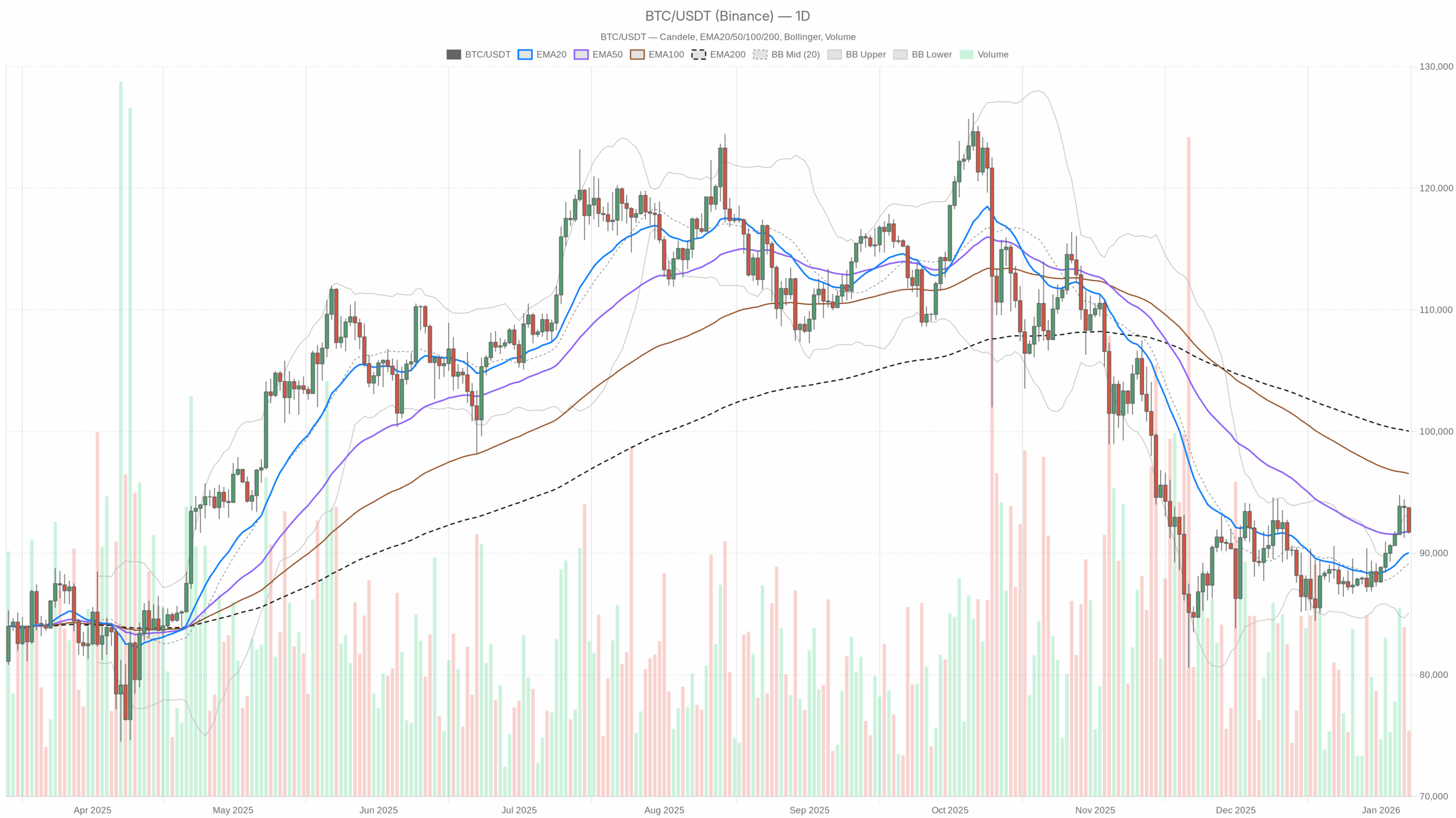 Die Unterstützung bleibt robust im Bereich von $94.000 bis $95.000, gestützt durch die jüngste Ansammlung von mittelgroßen bis großen Haltern (On-Chain-Daten zeigen, dass Wallets, die 100–10.000 BTC halten, seit Anfang Januar Zehntausende von Münzen hinzugefügt haben). Das Volumen war gesund, und die Momentumindikatoren neigen sich nach konstruktiv, nachdem weichere als erwartete Inflationsdaten die Risikobereitschaft gesteigert haben.