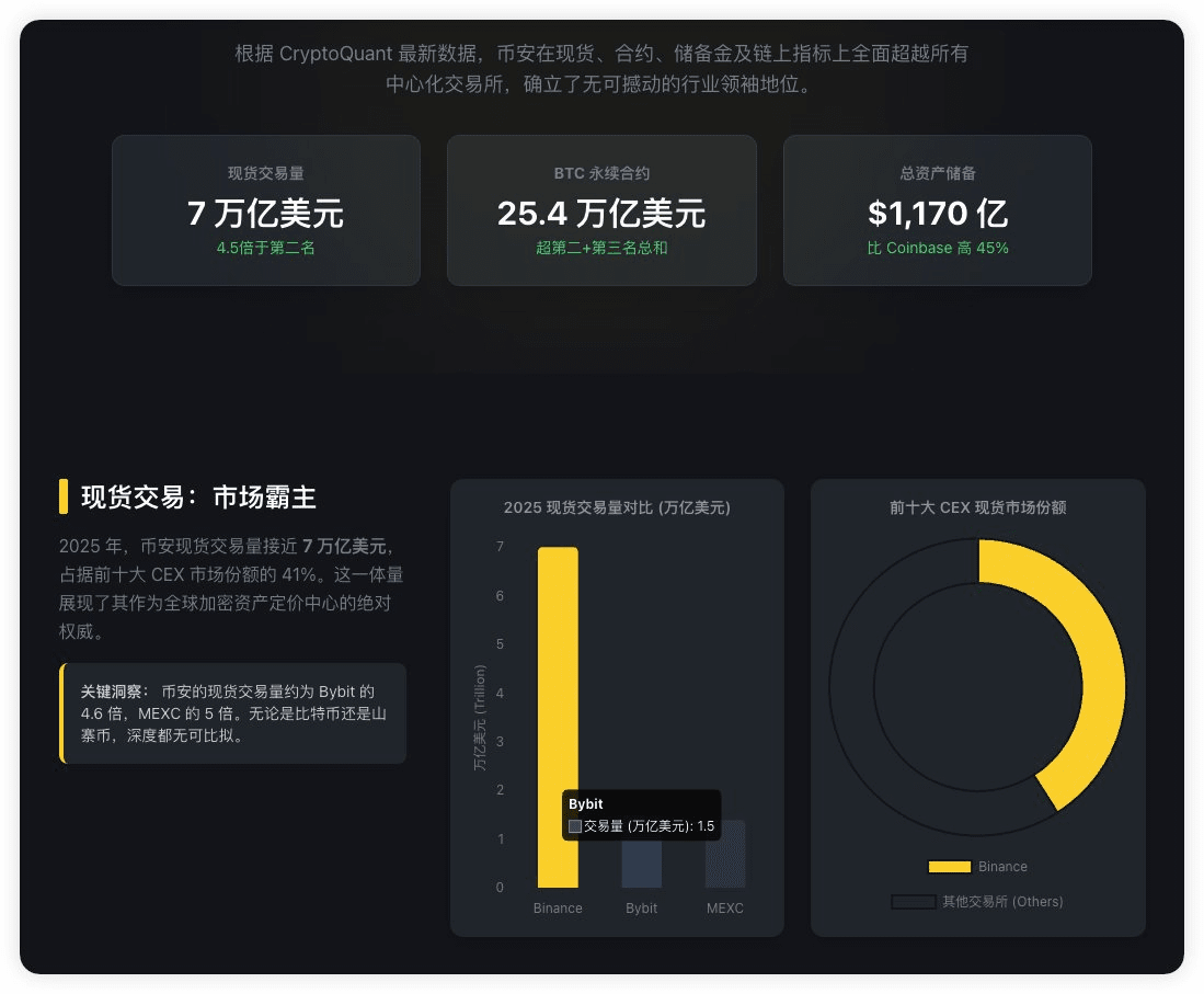 Die jährliche Exchange-Berichterstattung von CryptoQuant 2025 ist erschienen, und Binance hat sich bereits zu einem schwarzen Loch globaler Liquidität im Bereich Kryptowährungen entwickelt. In der Exchange-Branche ist Binance der unangefochtene Marktführer in Bezug auf Liquidität.