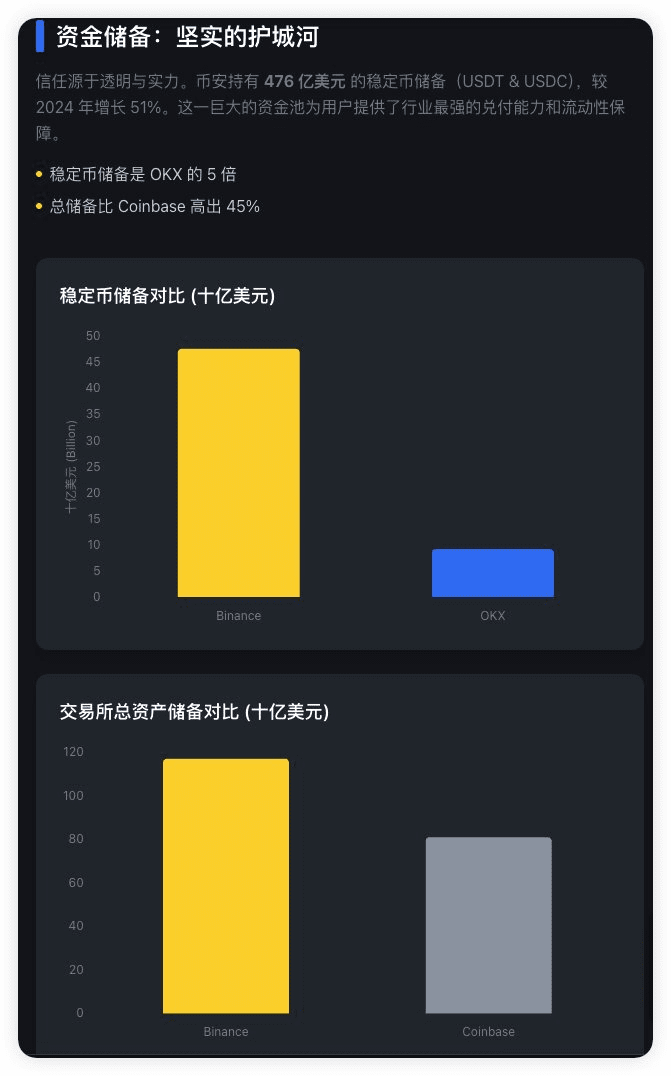 Stablecoin-Reserve: Binance hält 47,6 Milliarden USDT und USDC. Im Vergleich dazu beträgt die Reserve von OKX, dem zweitplatzierten Anbieter, nur 9,3 Milliarden US-Dollar. Die Tiefe der Stablecoins bei Binance ist fünfmal so groß wie die von OKX.