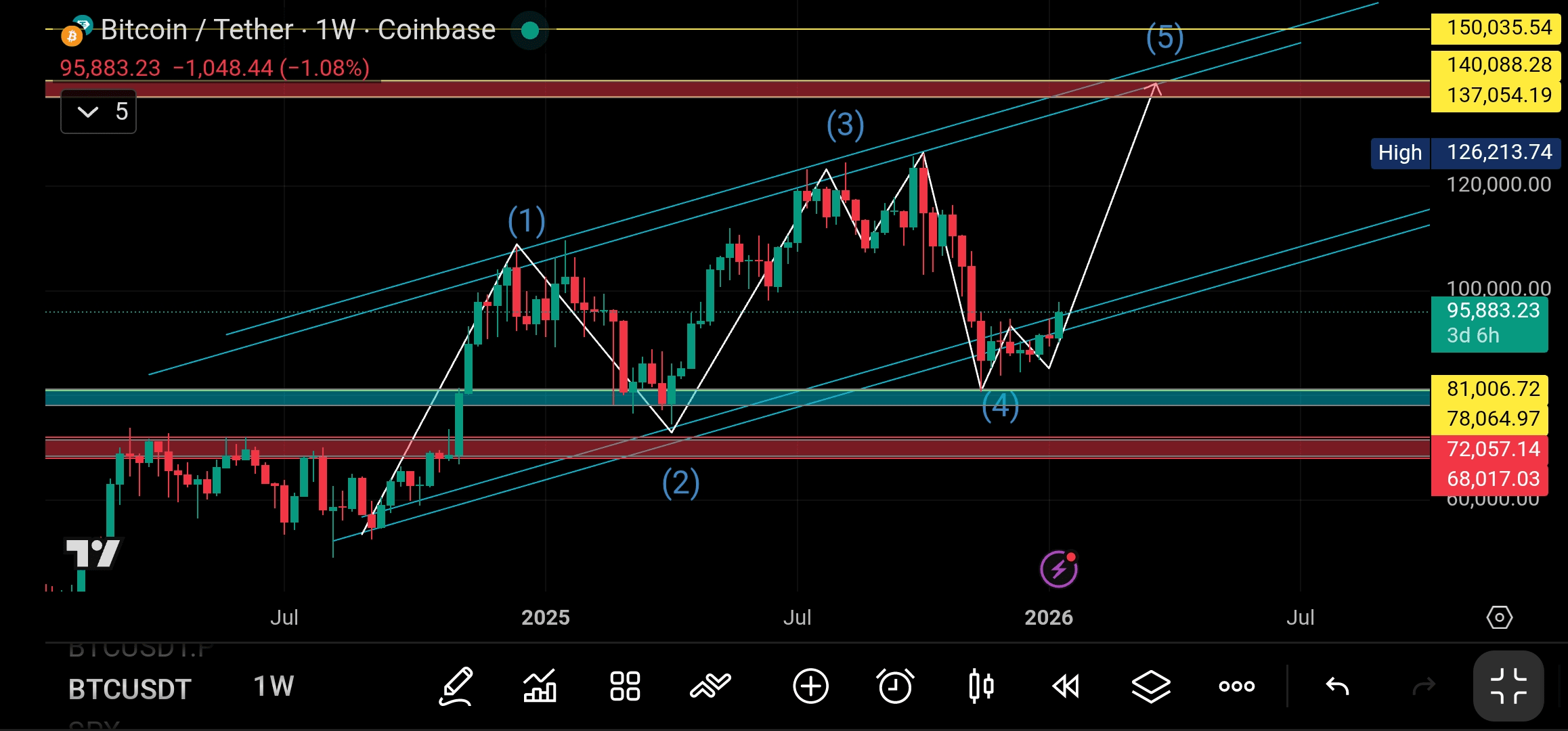 Bedeutung: Dies ist die "Muss-halten"-Ebene. Nach der Elliott-Welle-Theorie darf Welle 4 nicht mit dem Gipfel von Welle 1 (der viel niedriger war) überlappen. Ein Rückgang unter 70.000 USD würde die aktuelle impulsive "Zählung" für viele Händler technisch ungültig machen und könnte auf einen Wechsel in einen langfristigen Bärenmarkt hinweisen.