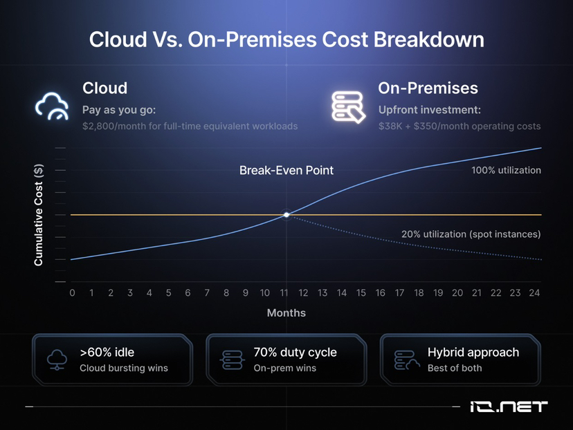Der Break-even-Punkt für die lokale Bereitstellung liegt bei 14 Monaten, dies gilt jedoch nur, wenn die Geräte 24/7 rund um die Uhr betrieben werden. Wenn die Betriebszeit der Arbeitslast nur 20 % beträgt, hat die Nutzung von Cloud-Spot-Instanzen (Spot Instances) eine bessere Kapitalausgaben (Capex) Effizienz.