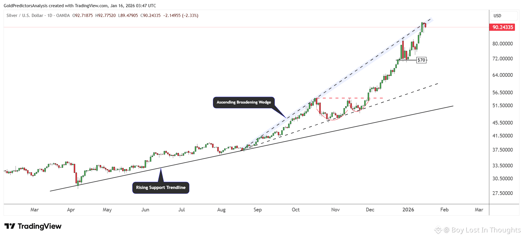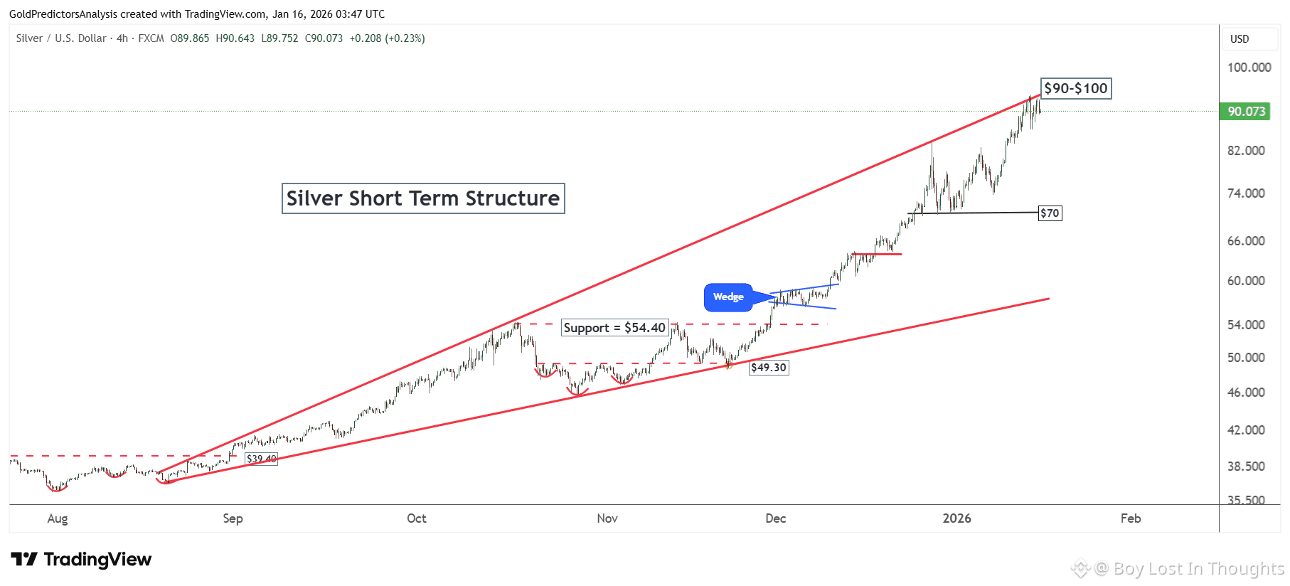 Silver is correcting from a strong resistance zone ($90–$100). A break above $100 could renew upward momentum, while a pullback toward $60–$70 may offer a favorable buying entry.