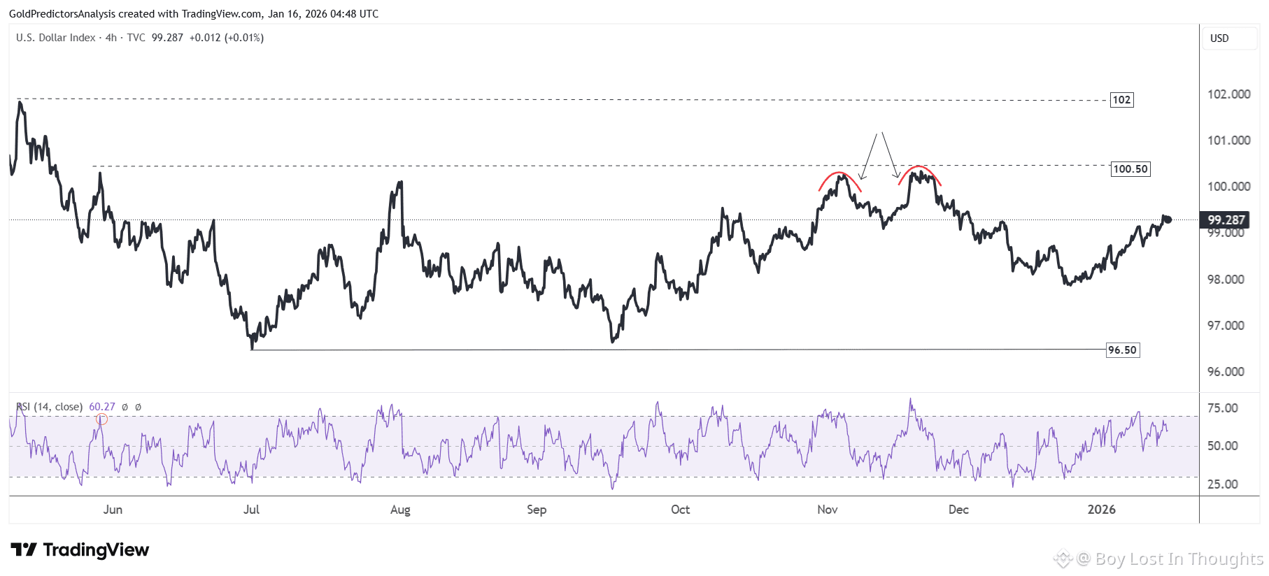 The USD Index is consolidating between 96.50 and 100.50. A break above 100.50 could propel it toward 102, while a drop below 97.50 may lead to a test of 96.50.