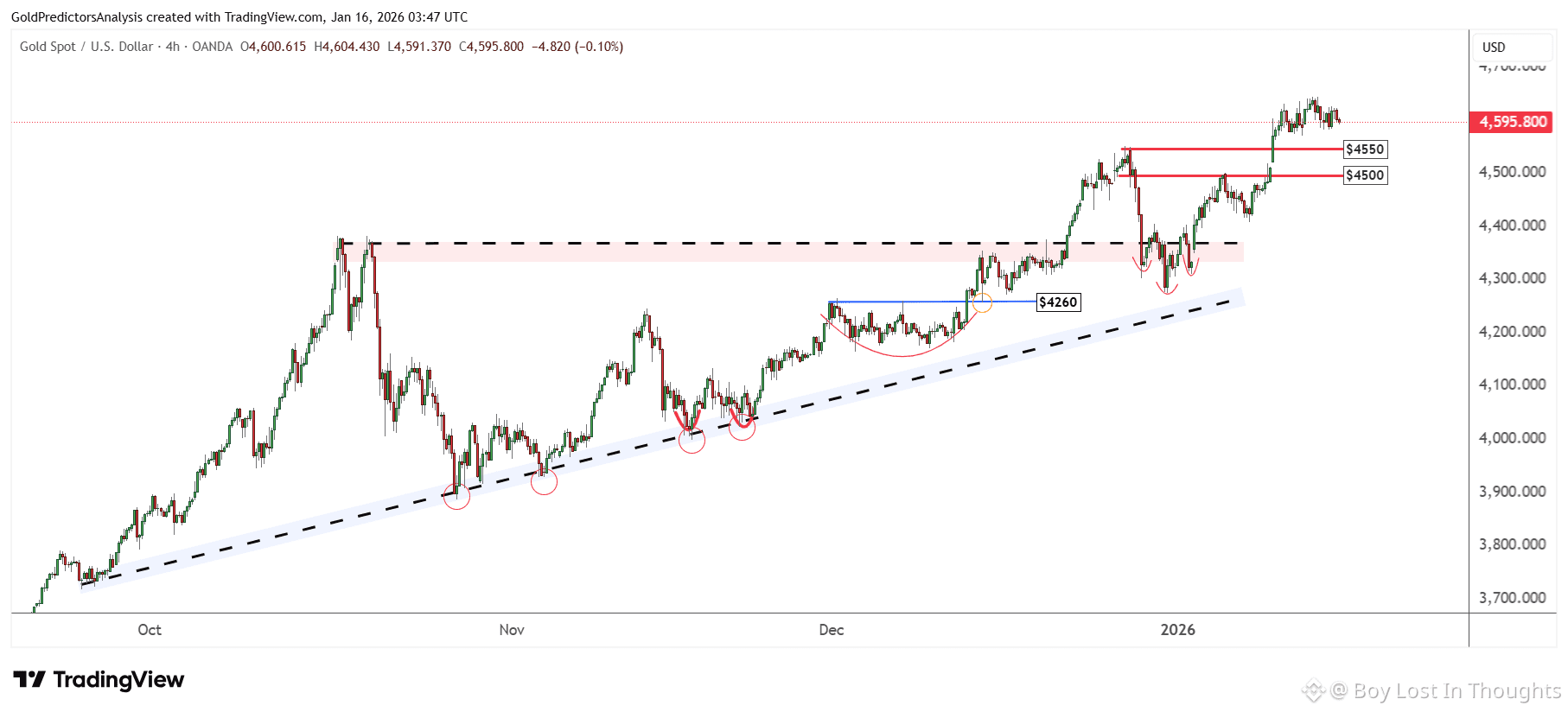 Gold is consolidating above $4,600; a rebound from $4,260 support suggests the current dip may be a short-term buying opportunity.
