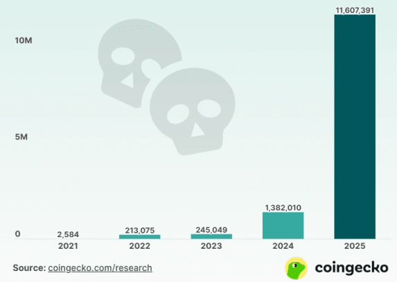Mehr als 11,6 Millionen Token hörten 2025 auf zu existieren und stellten einen absoluten Jahresrekord in der Geschichte des Kryptowährungsmarktes dar. Dies berichteten die Analysten von CoinGecko, die solche riesigen Zahlen durch die allgemeine Turbulenz auf dem Markt im Laufe des Jahres erklärten, die den Memecoin-Sektor besonders hart traf.