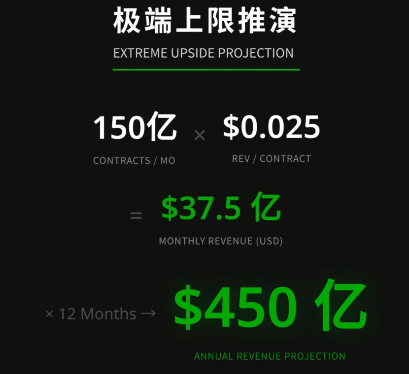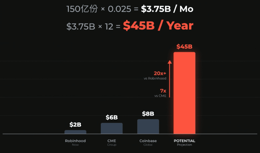 Hier eine extreme Obergrenze: Wenn Robinhood eine durchschnittliche monatliche Vertragsmenge von 15 Milliarden erreichen kann und jeder Vertrag eine Internalisierung von 0,025 USD bringt, könnte das theoretische Jahreseinkommen 45 Milliarden USD betragen. Was bedeutet das? Das wäre fast das Siebenfache des Jahresumsatzes der weltweit größten Derivatebörse CME und mehr als das 20-fache des derzeitigen Gesamteinkommens von Robinhood.