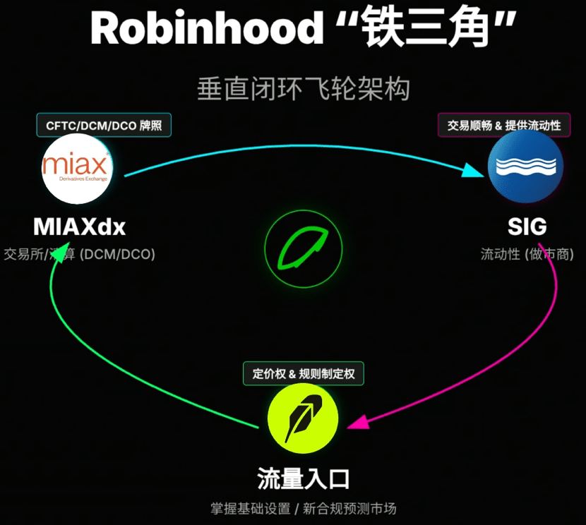 Der Schlüssel zu MIAx liegt darin, dass es sowohl DCM- als auch DCO-Lizenzen besitzt und die Grundlage für eine regulierte Börse und ein Clearinghaus bietet. Susquehanna (SIG), ein etablierter Market Maker, liefert Liquidität und Marktiefe. Robinhood fungiert als Traffic- und Distributionskanal, sodass eine neue, regulierte Prognosemarktinfrastruktur entsteht, die vollständig in eigenen Händen liegt. Alle Aspekte wie Traffic-Quellen, Börsenregeln, Clearing und Gebühren sowie die Preisgestaltung liegen in eigener Hand.