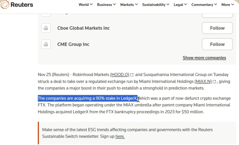 Am 27. November berichtete Reuters, dass Robinhood und Susquehanna 90 % der Anteile an MIAXdx übernehmen und die Betriebsaufnahme für 2026 geplant ist, mit einer Übergabe im ersten Quartal.