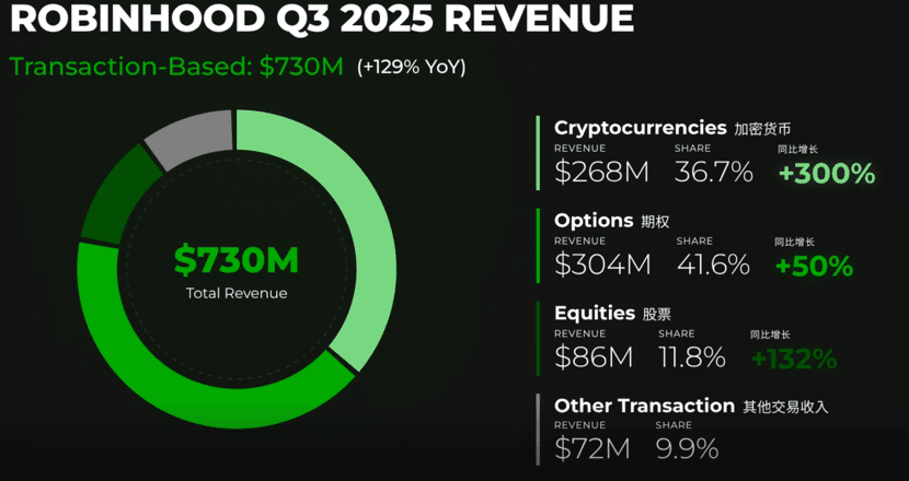 Die Daten zeigen, dass im dritten Quartal 2025 die Einnahmen aus Optionen 304 Millionen USD und die Einnahmen aus Krypto 268 Millionen USD betrugen, während Aktien lediglich 86 Millionen USD ausmachten. Im Oktober 2025 überstieg das monatliche Handelsvolumen des Prognosemarktes, also der Ereignisverträge, 2,5 Milliarden. Dieses Volumen in einem Monat überstieg das gesamte Handelsvolumen des dritten Quartals und zeigt ein rapides Wachstum.