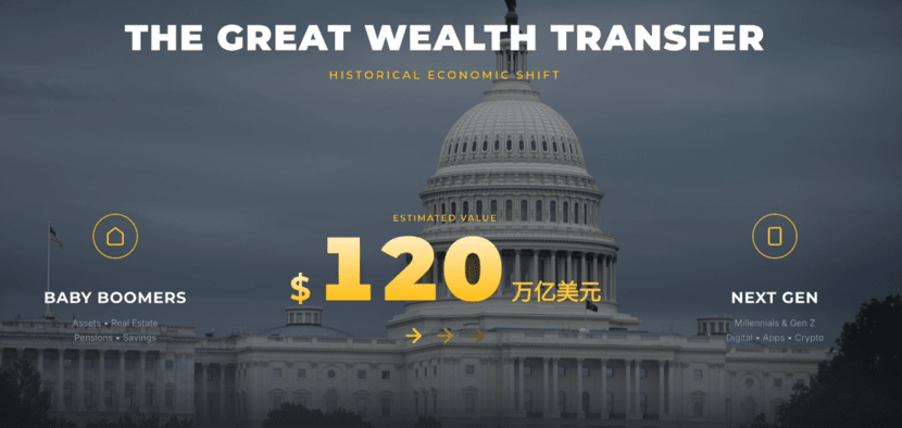 In den nächsten zwanzig Jahren findet in den USA eine, man könnte sagen, epische Übergabe von Wohlstand statt, bei der geschätzt bis zu 80 Billionen bis 120 Billionen Dollar an Vermögenswerte von der „Babyboomer-Generation“, die Banken und Renten vertrauen, an die jüngere Millennial-Generation und die Generation Z übergehen werden.