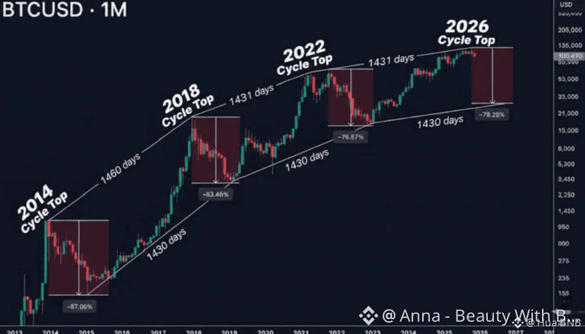 If #Bitcoin 4 years cycle continues to play out as it has in the past, 2026 could turn into a heavy correction year 😱 — unless something truly game-changing enters the market. Historically, $BTC doesn’t move randomly; it follows a rhythm that has repeated across every major cycle so far.Looking back at the data, around two years after each halving, Bitcoin has entered a deep downtrend and formed a long-term bottom: • 2014: -87% drop (from $1,240 to $166)• 2018: -84% drop (from $19,804 to $3,124)• 2022: -77% drop (from $69,000 to $15,473)If history stays consistent in this cycle: • $BTC topped near $126,000• A typical 70–75% correction would place the potential bottom around $30,000–$37,000From my personal view, this cycle feels close to its later stages. The 4-year Bitcoin cycle has remained surprisingly accurate across multiple market eras, and so far, nothing has truly broken that structure.The big question now is: Do you think the 4-year Bitcoin cycle will repeat again in 2026 — or is this time different?Share your thoughts below 👇$BTC BTC #MarketRebound #BTCVSGOLD #MarketRebound #BTC100kNext ? #StrategyBTCPurchase
