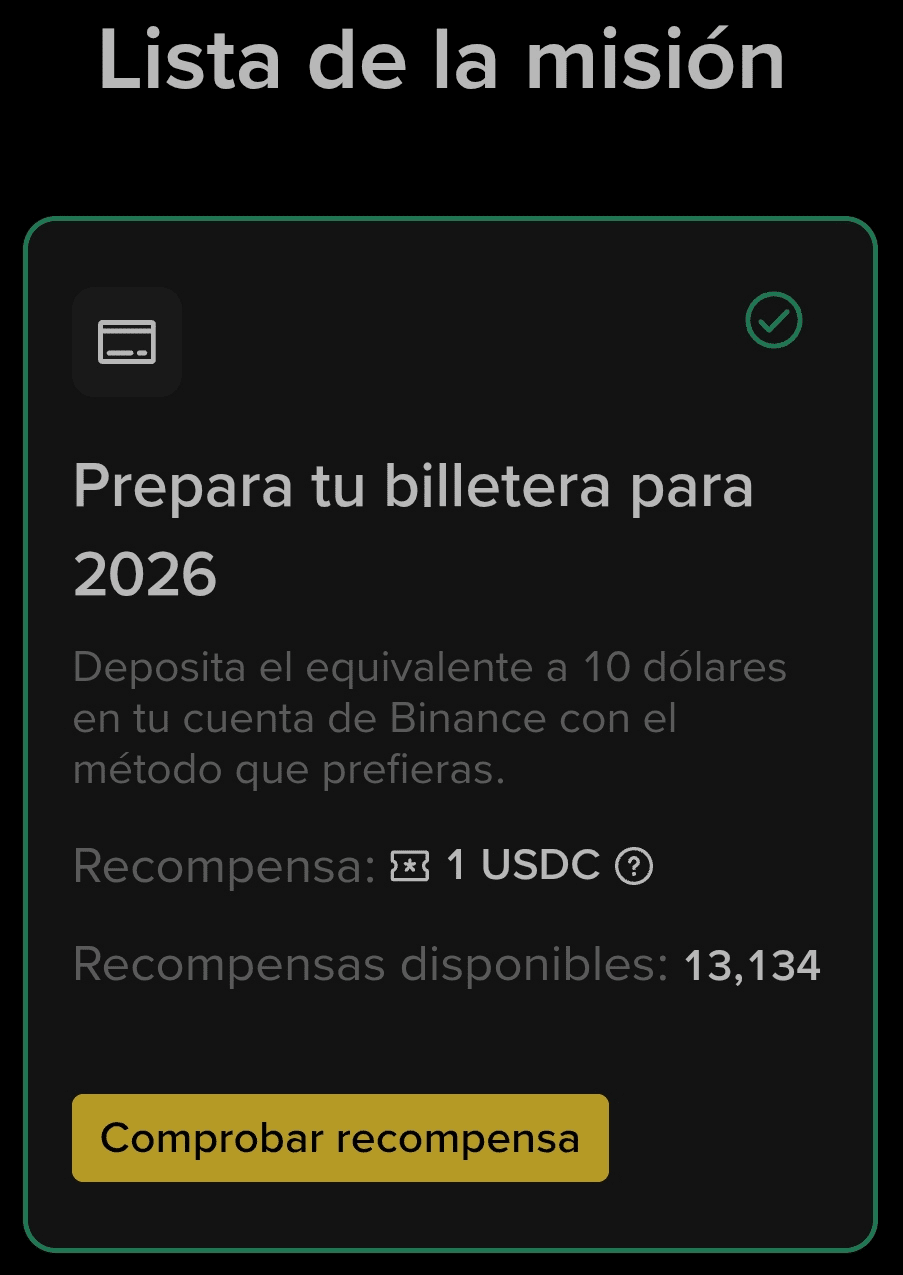 Schließe die Neujahrsmissionen ab, um bis zu 12 USDC zu gewinnen! Ein kleines Extra schadet niemandem. Alle Missionen haben einen Preis und du kannst sie in der Reihenfolge machen, die du möchtest. Denk nur daran, sie vor dem 31. Januar zu erledigen. Nimm teil und starte das Jahr 2026 mit dem rechten Fuß und mit Binance: Es gibt einen Preis für jede abgeschlossene Mission und einen zusätzlichen, wenn du alle machst. Exklusiv für Nutzer in Bolivien, Mexiko, Paraguay und Venezuela.