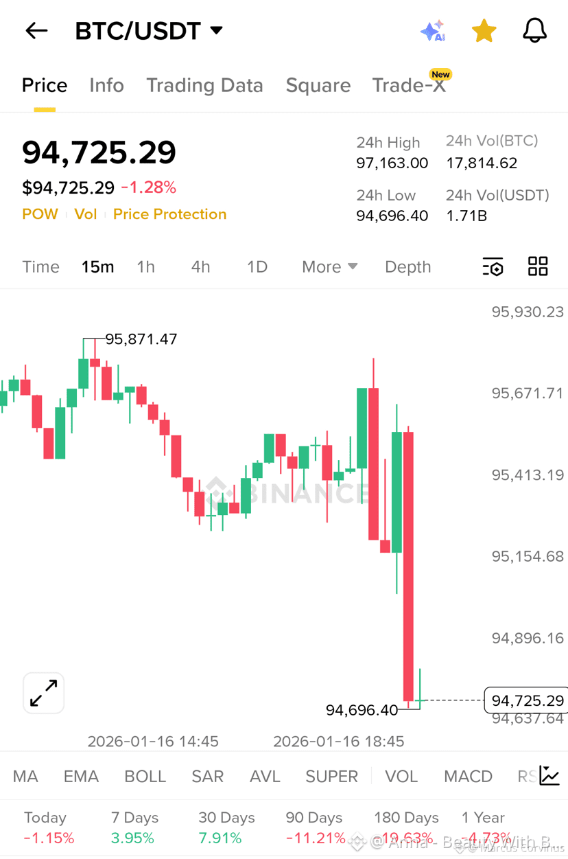 $BTC is because price just did a sharp liquidation style flush to 94696 and instantly bounced. I’m watching it because this kind of fast drop and quick reclaim often marks a short term bottom and sets up a relief push if buyers hold the level.Market readBTC topped near 95871, then started drifting lower with weak candles. The big event is the red dump into 94696, followed by an immediate reaction bounce to the 94700 to 94800 area. That shows demand is sitting there. If BTC holds above 94696, the flush becomes a liquidity grab and the market can rotate back up into the prior range. If it loses 94696 again, the move can continue down because support would be broken.Entry PointEP 94720 to 94920This is the reclaim and stabilization zone right after the flush. I’m interested here only while price stays above the 94696 low.Target PointTP1 95250TP2 95670TP3 97160TP1 is the first recovery step and a common reaction area. TP2 is the mid range reclaim zone. TP3 is the previous 24h high retest area where sellers can show up again.Stop LossSL 94580If price closes below the 94696 low and can’t reclaim, the setup fails. I’m out.How it’s possibleIf BTC keeps holding 94696, sellers who chased the breakdown get trapped, and the market can squeeze back toward 95250 first. A reclaim of 95670 turns the structure back bullish intraday, and then a retest of 97160 becomes possible. This works because the flush likely cleared stops and forced liquidations, and the immediate bounce shows buyers absorbed it.I’m ready for the rotation.Let’s go and Trade now $BTC