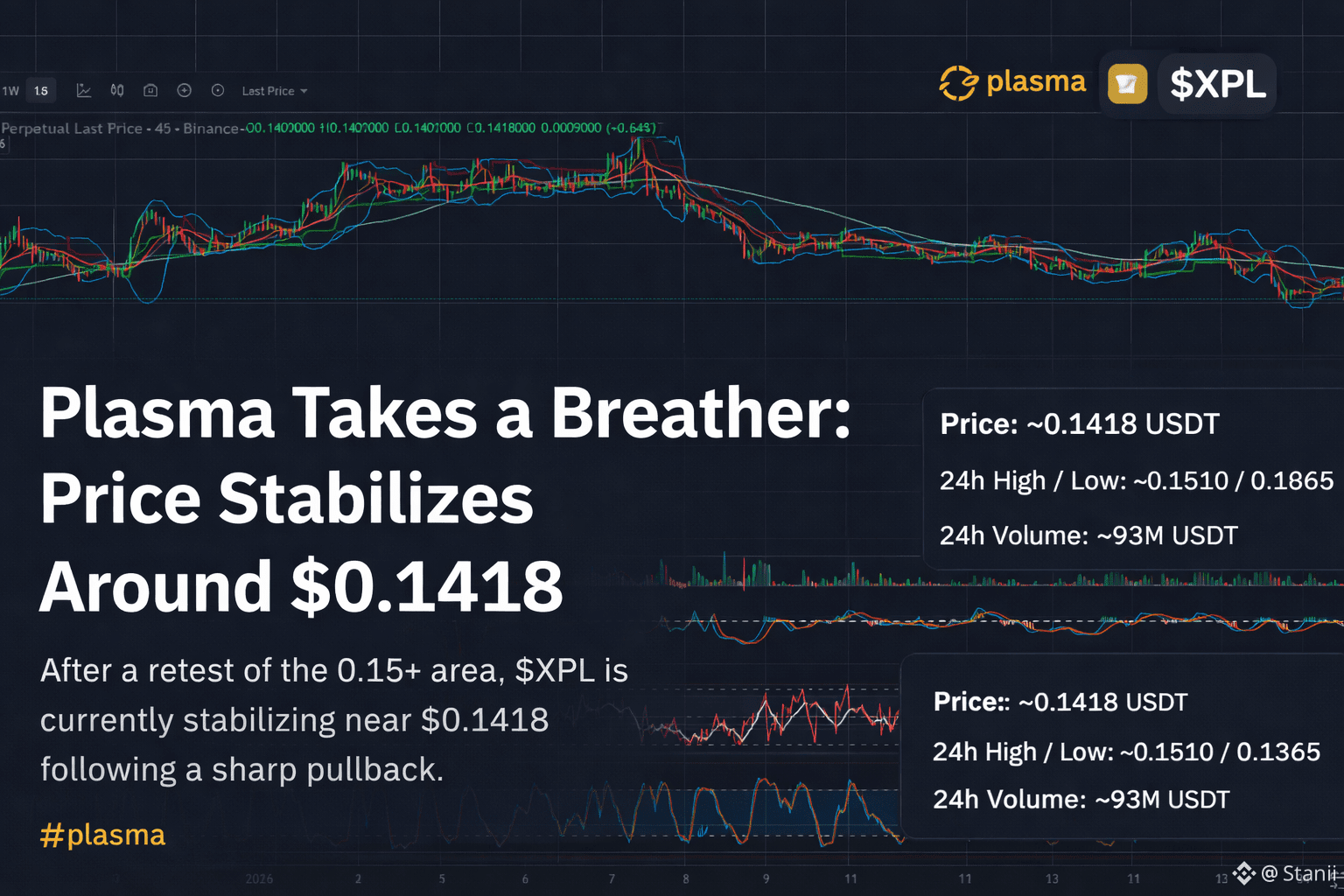 Plasma is moving through a phase that only shows its value if you actually watch the tape, not just headlines. On the 45-minute chart, $XPL is currently trading around 0.141–0.142 USDT, after a sharp pullback from the 0.15+ region. Price is sitting below short-term moving averages, volatility has compressed, and momentum indicators are neutral to slightly oversold. This is not euphoria, this is digestion. Over the last 24 hours, XPLUSDT Perp volume is roughly 648M XPL, translating to about 93M USDT, with open interest near 52M USDT. That tells a clear story: participation hasn’t disappeared, leverage is still present, but direction is being decided slowly.