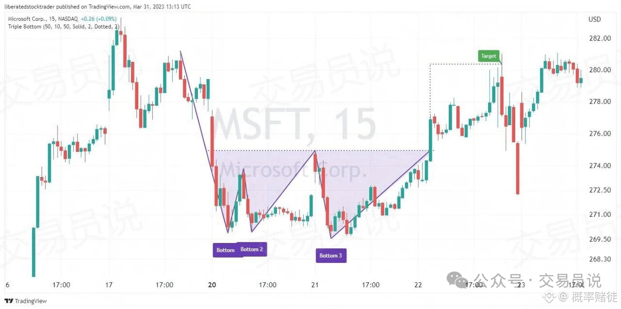 在识别三重底形态时,应观察证券价格是否形成三个清晰可辨的低点,共同构成一个“VVV”形态。一般来说,该形态既可以出现在日内图表中,也可以在日线图上观察到。三重底形态在15分钟图和1小时图中出现得更为频繁。