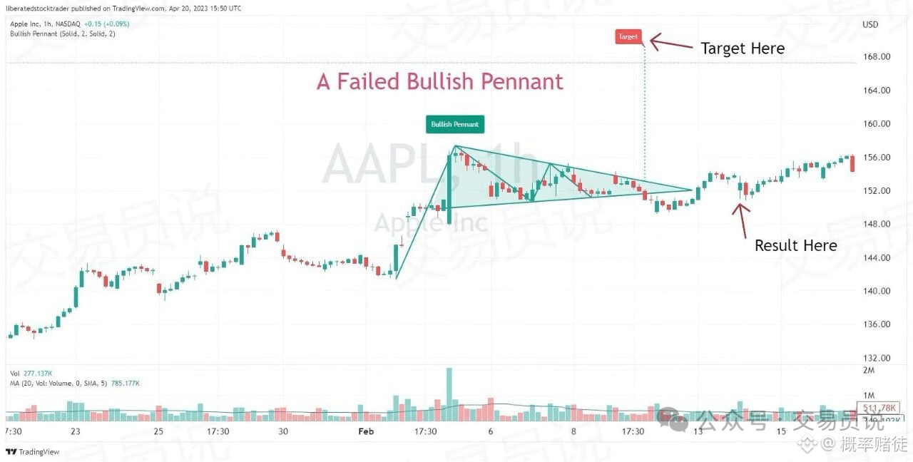然而,从统计角度来看,看涨三角旗形态的可靠性并不高。在牛市环境中,其向上突破的成功率仅为54%,平均涨幅约7%。该形态的失败率高达46%,在实战中应格外谨慎,尽量避免过度依赖。
