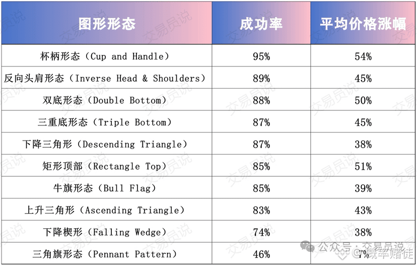 例如:杯柄形态在价格向上突破阻力位后,成功率高达95%,平均涨幅为54%。