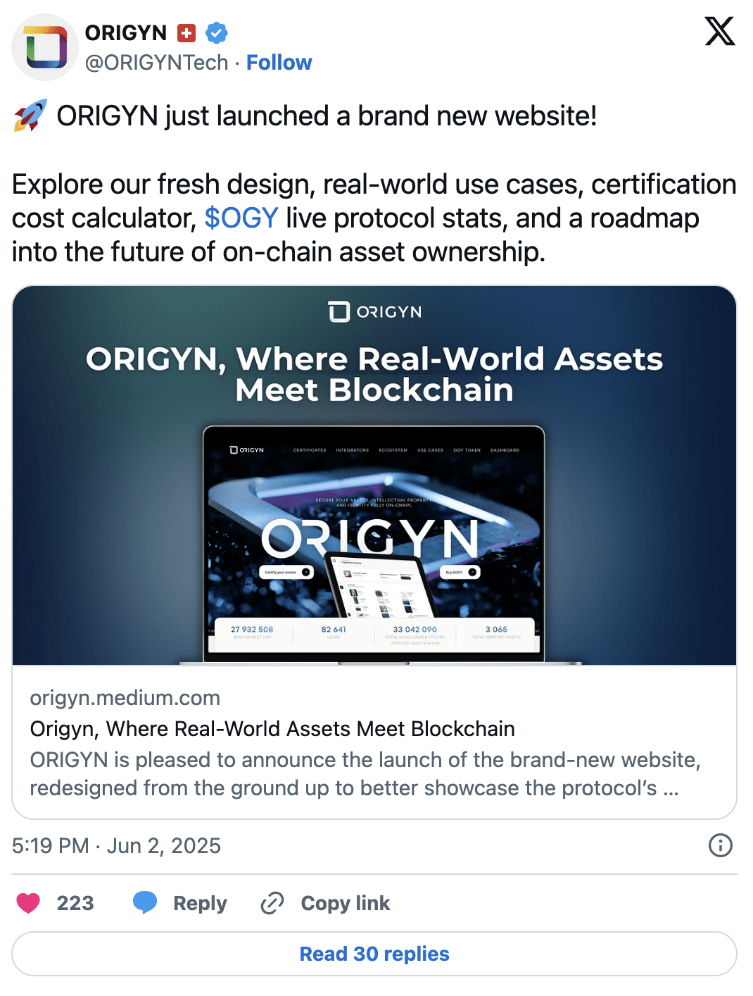 新网站上线:ORIGYN 推出了全新的网站,重点在于清晰度、生态系统统计数据以及面向创作者、品牌和认证机构的入门工具。