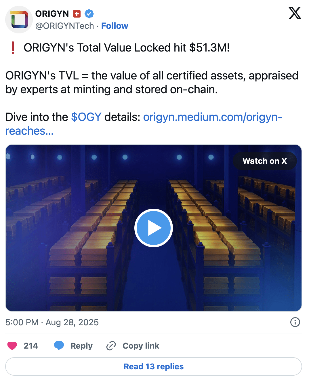TVL 里程碑:ORIGYN 的总锁定价值突破 5000 万美元,在链上保障了黄金、高级珠宝和收藏品等高价值资产的安全。