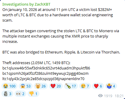 Es gibt kein Leugnen über das Ausmaß des Vorfalls. Das Opfer hat angeblich 1.459 BTC und 2,05 Millionen LTC in einem ausgeklügelten Social-Engineering-Angriff auf eine Hardware-Wallet verloren. Teile dieser Vermögenswerte wurden in XMR umgewandelt, um die Datenschutzfunktionen – Ringunterschriften, Stealth-Adressen und vertrauliche Transaktionen – auszunutzen, was einen Anstieg des kurzfristigen Kaufdrucks verursachte.
