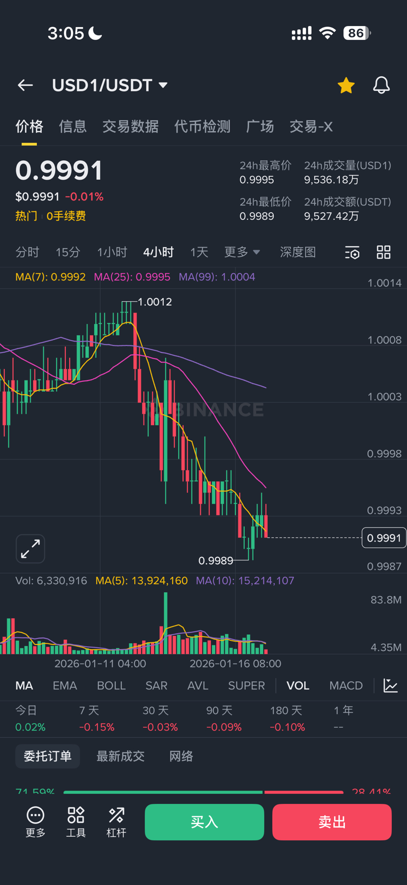 Die Veranstaltung endet in zehn Tagen, und alle beginnen mit dem Ausverkauf$USD1 . Meine 8 Konten mit je 50.000 USDT sind unverändert. Der Preis von USD1/USDT ist leicht gefallen, jetzt beträgt der Kurs ≈0.9991 (tiefster Punkt in 24h war 0.99889), von einem Höchststand von 1.0020 hat er bereits ≈0.1%-0.2% Abwertung. Wenn du USD1 zur Geldanlage hältst, werden kurzfristige Schwankungen + das potenzielle Risiko einer weiteren Entkopplung einen Teil der Rendite auffressen, besonders bei größeren Beständen ist dies deutlicher, aber keine Sorge, es könnte weiter fallen, ich glaube aber, dass es später wieder steigen wird.