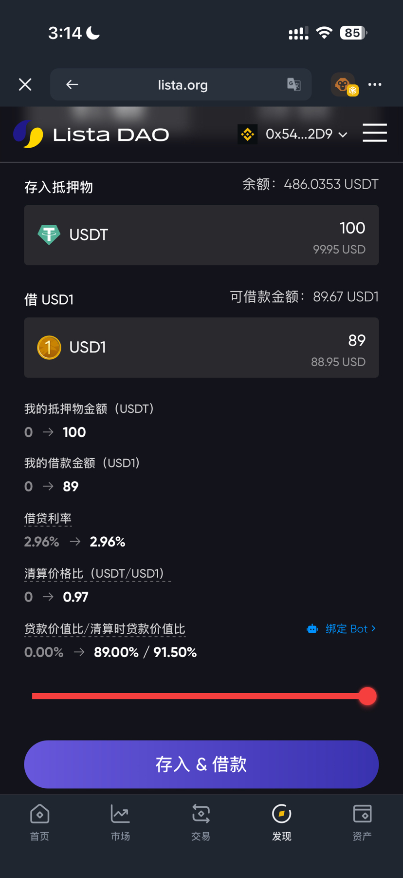 4. Vorgehen: Hinterlege Sicherheiten (z.B. 100 USDT), kannst ≈89 USD1 leihen (LTV 89-91.5%). Zinssatz fixiert bei 2.96%, mit einem Klick „einzahlen & leihen“. Halte den Health Factor >150% zur Vermeidung von Liquidation.