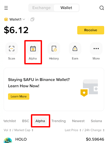 Alpha funktioniert normalerweise über Binance Wallet, das eine nicht verwahrte Web3-Wallet ist. Das bedeutet, dass die Benutzer ihre eigenen Vermögenswerte kontrollieren und direkt mit Blockchain-Netzwerken interagieren.