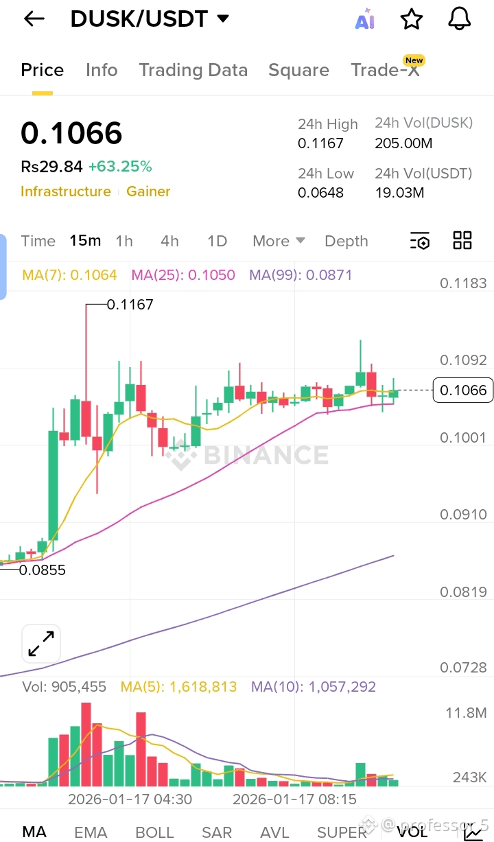 Strong momentum after a sharp breakout from ~0.085 with high volume, price now consolidating around 0.106–0.107 above MA(7) and MA(25), which signals short-term bullish control while MA(99) far below confirms overall trend strength. Immediate resistance is 0.109–0.117 zone; a clean break with volume can continue upside, otherwise expect sideways or mild pullback. Key support sits at 0.102–0.100, below that 0.095. Volume has cooled, so best strategy is buy on dips near support or trade breakout with strict stop-loss below 0.100, partial profit near resistance, and avoid chasing after large green candles.