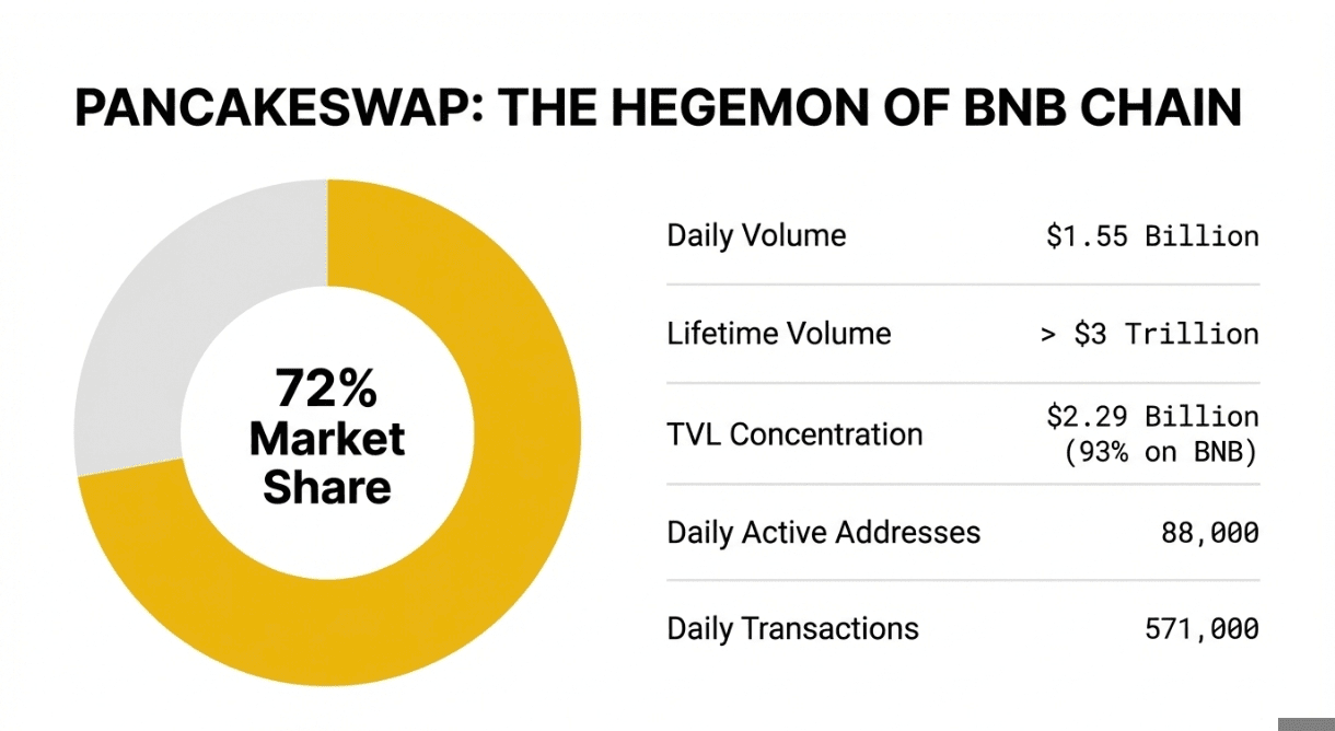 PancakeSwap hielt eine überwältigende Marktführerschaft mit 1,55 Milliarden Dollar täglichem Handelsvolumen, was 72% aller DEX-Aktivitäten auf BNB Chain entspricht. Das kumulierte Volumen des Protokolls erreichte bis Ende 2024 1,935 Billionen Dollar, wobei die Aktivitäten im Jahr 2025 das gesamte Lebenszeitvolumen über 3 Billionen Dollar schoben. Der TVL von 2,46 Milliarden Dollar konzentrierte sich zu 93% auf BNB Chain bei 2,29 Milliarden Dollar, während die verbleibenden 7% auf andere unterstützte Netzwerke verteilt waren.