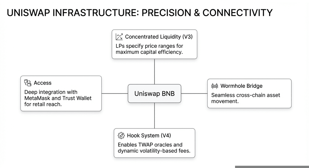 Das konzentrierte Liquiditätsmodell von Uniswap V3 erlaubte es Liquiditätsanbietern, Preisbereiche anzugeben, wodurch die Kapitaleffizienz im Vergleich zur vollständigen Liquiditätsbereitstellung verbessert wurde. Das Hook-System von V4 ermöglichte benutzerdefinierte Logik für Pools, einschließlich zeitgewichteter Durchschnittspreis-Orakel, dynamischer Gebühren und Limitauftragsfunktionen. Die Integration der Wormhole-Brücke erleichterte grenzüberschreitende Liquiditätsströme und ermöglichte es den Nutzern, Vermögenswerte nahtlos zwischen der BNB Chain und anderen unterstützten Netzwerken zu bewegen.