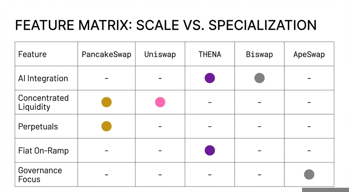 Uniswaps starke zweite Platzierung spiegelte die Markenbekanntheit und die Migration der Ethereum-Händler wider, die niedrigere Gebühren suchten. THENA, Biswap und ApeSwap kontrollierten zusammen weniger als 2 % des Marktanteils, was die Schwierigkeit verdeutlicht, gegen etablierte Marktführer zu konkurrieren, selbst mit innovativen Funktionen.