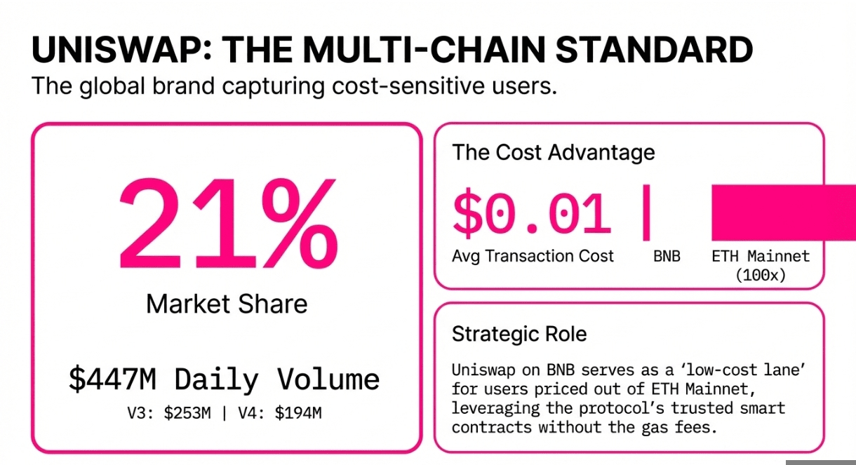 Uniswaps Bereitstellung auf der BNB Chain verarbeitete 447 Millionen $ an täglichem Volumen, aufgeteilt zwischen V3 mit 253 Millionen $ und V4 mit 194 Millionen $, was 21 % Marktanteil erfasste. Das kumulative Volumen auf BSC erreichte bis Ende 2024 114,6 Milliarden $, wobei 2025 erhebliche zusätzliche Handelsaktivitäten hinzukamen. Der TVL auf BSC betrug 89 Millionen $, was einen kleinen Bruchteil des globalen Gesamtwerts von Uniswap von 5,3 Milliarden $ darstellt.