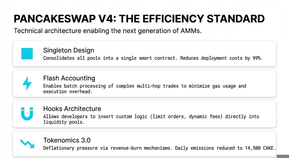 PancakeSwap V4 führte eine revolutionäre Architektur mit hook-basierter Anpassung ein, die es Entwicklern ermöglichte, benutzerdefinierte Gebührenstrukturen, Limitaufträge und Preisstabilitätsmechanismen zu implementieren. Das Singleton-Design konsolidierte alle Pools in einen einzigen Vertrag, reduzierte die Bereitstellungskosten um 99 % und ermöglichte ein kapitaleffizientes Liquiditätsmanagement. Flash-Buchhaltung ermöglichte die Batch-Verarbeitung komplexer Multi-Hop-Handelsgeschäfte, verbesserte die Ausführungsgeschwindigkeit und senkte die Gaskosten.