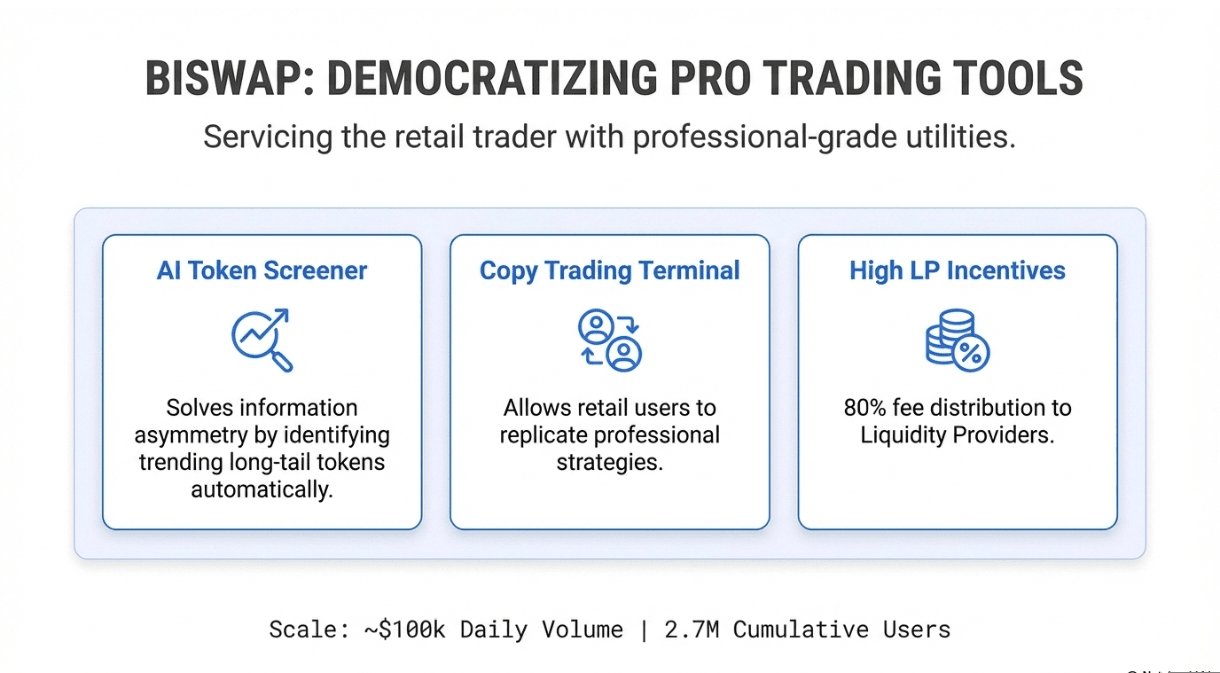 Die gemeinschaftliche Governance kontrollierte die Landwirtschaftszuweisungen und Gebührenstrukturen und gab den Nutzern direkten Einfluss auf die Richtung des Protokolls. Das Cross-EVM-Trading-Terminal ermöglichte den einheitlichen Zugriff auf Liquidität über alle unterstützten Chains hinweg und vereinfachte das Multichain-Positionsmanagement. Trotz starker Funktionalitäten deutete das geringe Volumen von Biswap auf Herausforderungen bei der Benutzerakquise und dem Liquiditätsaufbau hin.