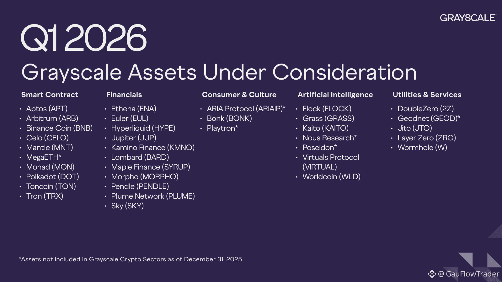 Grayscale has released an updated list of digital assets it’s monitoring for potential future investment products, signaling broader institutional attention beyond $BTC .