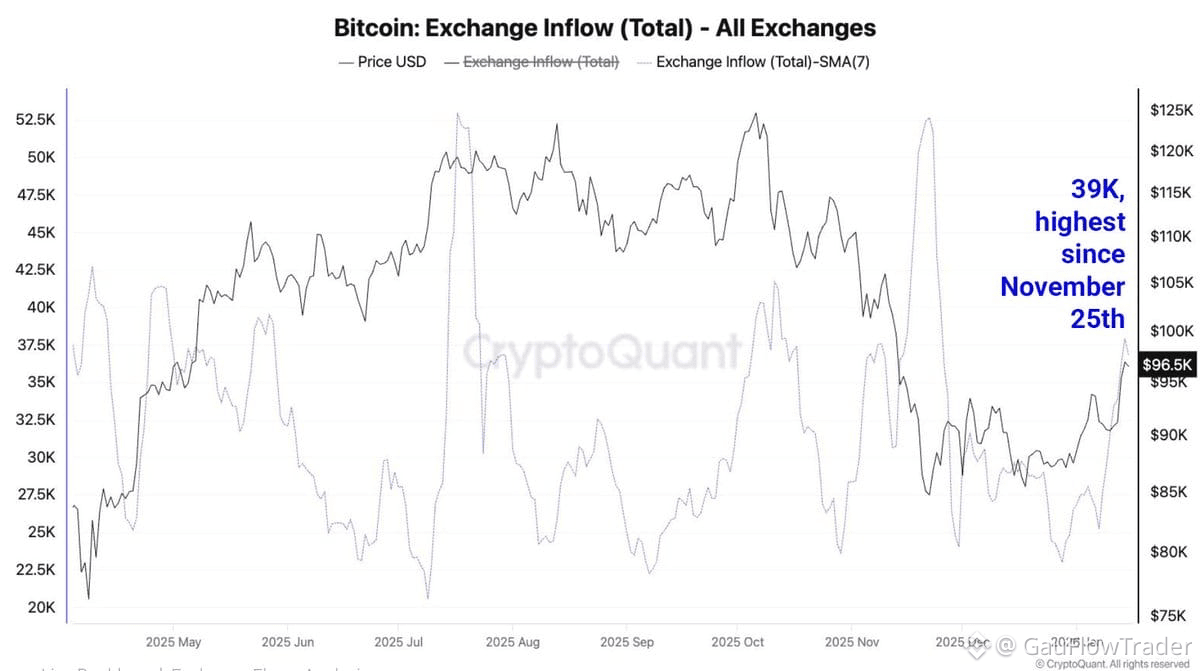 Total Bitcoin exchange inflows have surged to a 7-day average of ~39,000 $BTC , marking the largest inflow level since November 25, 2025.