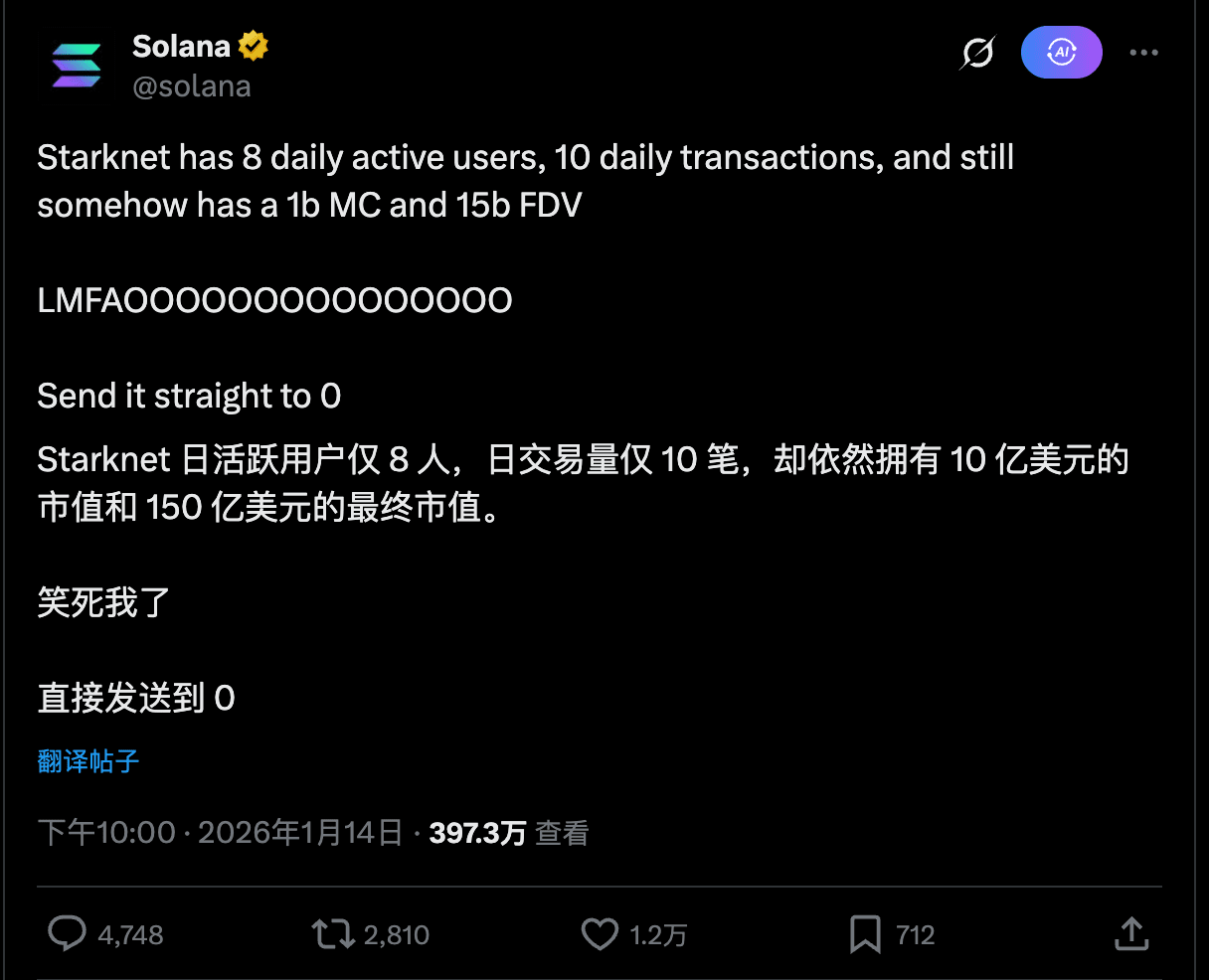Ich weiß, viele öffentliche Blockchains werden ignoriert, aber dieser Tweet vom offiziellen Solana-Account hat mich trotzdem schockiert. Starknet gehörte zu den „Big Four“ der L2-Ära und sammelte Hunderte Millionen Dollar ein – wie konnte es so tief fallen? Ich frage mich, was mit diesen legendären Projekten der Spitzenklasse passiert ist, nachdem die Airdrops abgeschlossen waren und der Hype nachließ.