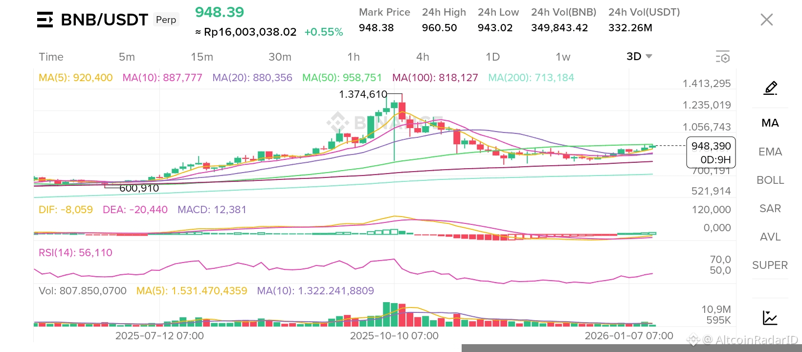 Berdasarkan grafik 3D, BNB saat ini berada di level $944,78.