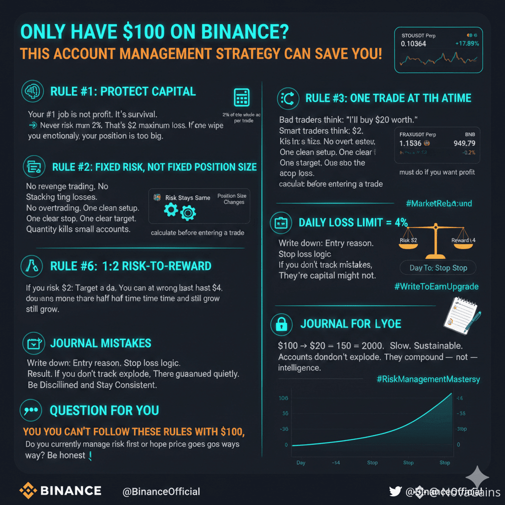 Managing an account on Binance with $100 or less requires discipline and smart strategy. Forget big, quick gains; focus on survival and steady growth.