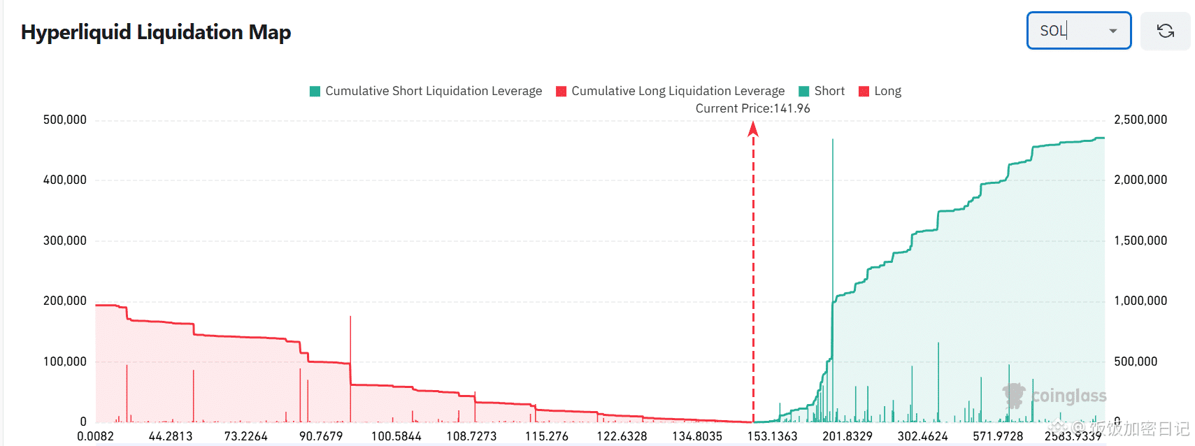 Hyperliquid 数据显示,价格上方 153、201 美元及 300 美元以上区域存在大量空头流动性,而 135 美元以下的多头清算量较少。这种不平衡降低下跌连锁风险,同时为上涨提供动力。如果价格继续走高,强制平仓可能加速上涨。