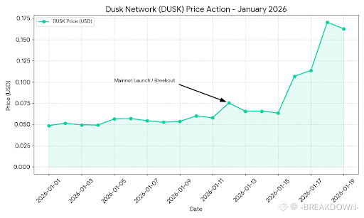 The Breakout: As seen in the chart, DUSK broke out of its $0.05–$0.06 range in early January. The momentum accelerated sharply after Jan 15th, peaking near $0.17.