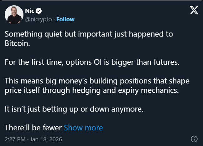 Der CEO von Coin Bureau, Nik Pakrin, bemerkte einen wichtigen strukturellen Wandel. In der letzten Woche überstieg das Volumen der offenen Positionen bei Bitcoin-Optionen die Werte der Futures.