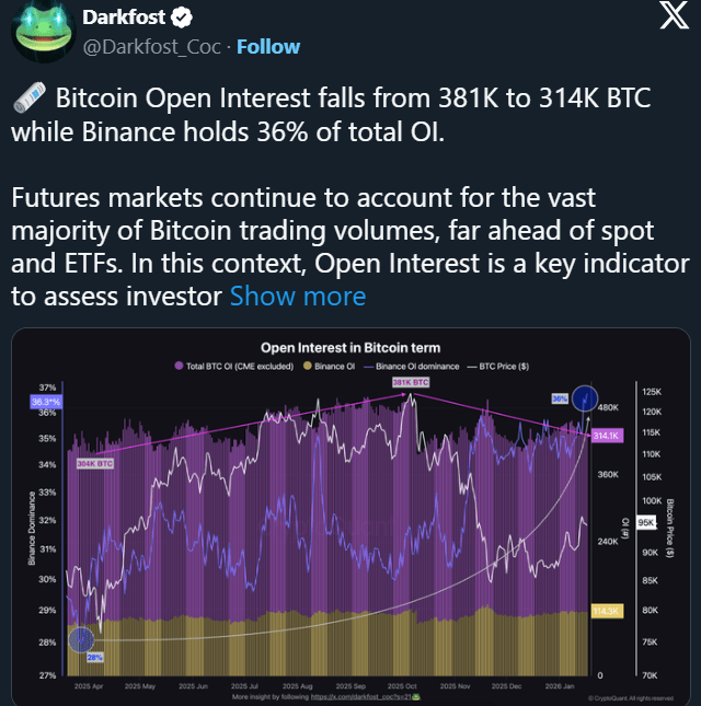 Der Analyst CryptoQuant unter dem Pseudonym Darkfost bemerkte, dass der Markt sich in Richtung Erholung bewegt. Die aktuelle Dynamik steht im Gegensatz zur Herbstkorrektur, als das offene Interesse aufgrund des Preisrückgangs um 17,5 % (von 381.000 BTC auf 314.000 BTC) sank.
