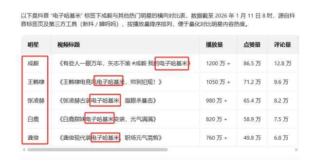 Die Gesamtanzahl der Aufrufe für Douyin-Einträge, die mit „#电子哈基米“ in Verbindung stehen, hat 1.7 Milliarden erreicht und umfasst Fans zahlreicher Prominente, darunter Cheng Yi, Zhang Linghe, Wang Hedi, Deng Wei, Chen Xingxu, Bai Lu, Gong Jun und mehr. Es ist zu einer allgemein anerkannten „sozialen Währung“ unter Idol-Fans geworden.