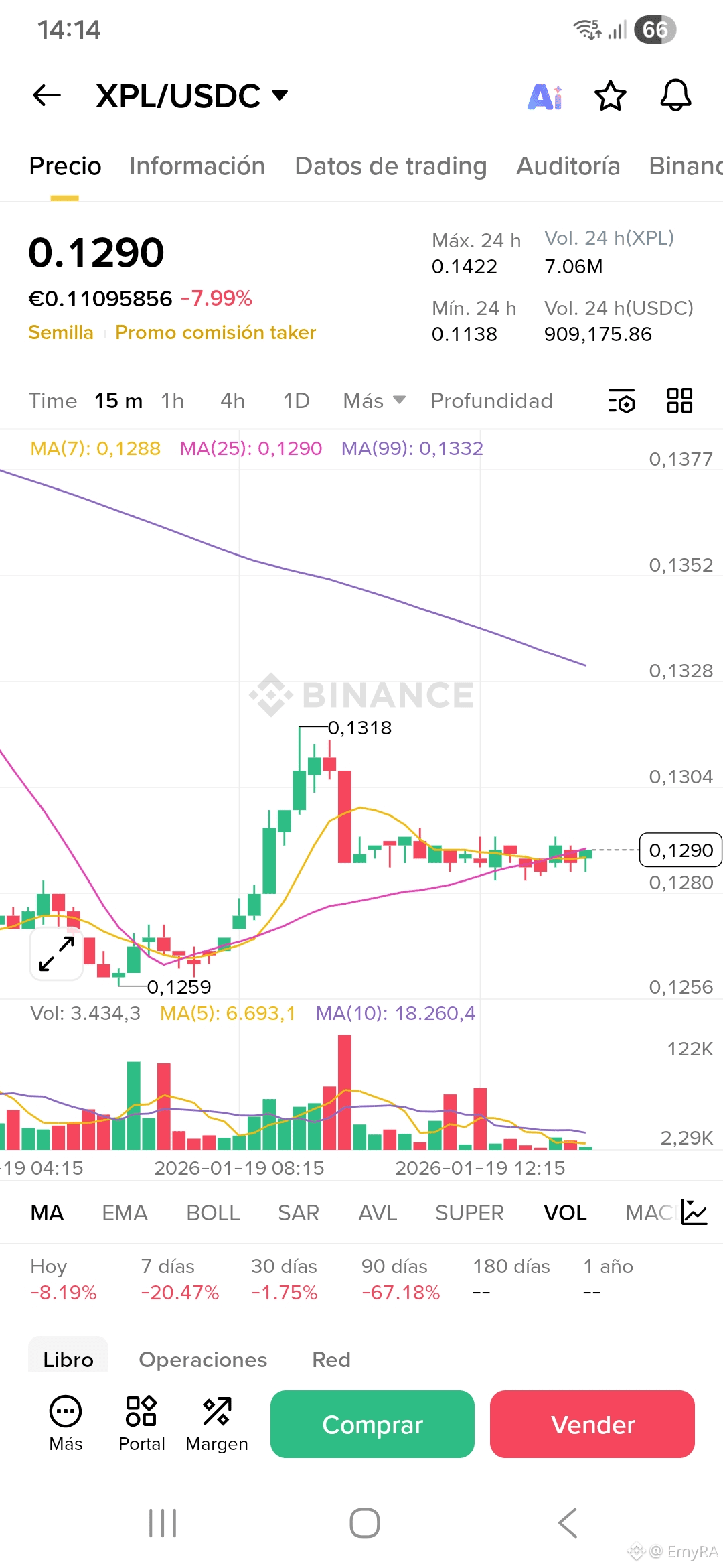 Chicos, hay momentos en el mercado en los que el precio deja de correr y, simplemente, se detiene. No porque falte interés, sino porque necesita tiempo. El gráfico de XPL/USDC está precisamente en uno de esos puntos. Tras un impulso claro que llevó al token de Plasmas hasta la zona de 0.1318, el mercado decidió frenar, no con violencia, sino con una corrección medida, casi reflexiva. La caída cercana al 8% en 24 horas no vino acompañada de pánico ni de velas descontroladas; llegó como suelen llegar las tomas de beneficio sanas: ordenadas, graduales y sin romper la estructura.