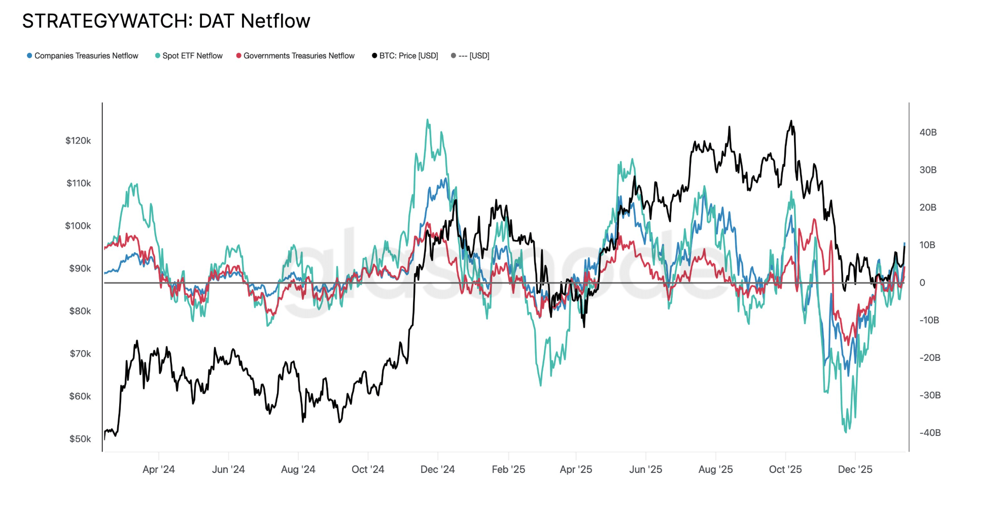Der vorherige Verkaufsdruck (tiefer Graben): Schaut auf die rechte Seite des Diagramms, der Nettostrom der Spot-ETFs (türkise Linie) und der Unternehmen (blaue Linie, wie MicroStrategy usw.) hatte Ende Dezember bis Anfang Januar einen deutlichen negativen Wert (ein großer Graben nach unten). Das erklärt, warum der Preis zuvor über 90.000 auf Widerstand gestoßen ist, da Institutionen tatsächlich Gewinne realisiert haben.