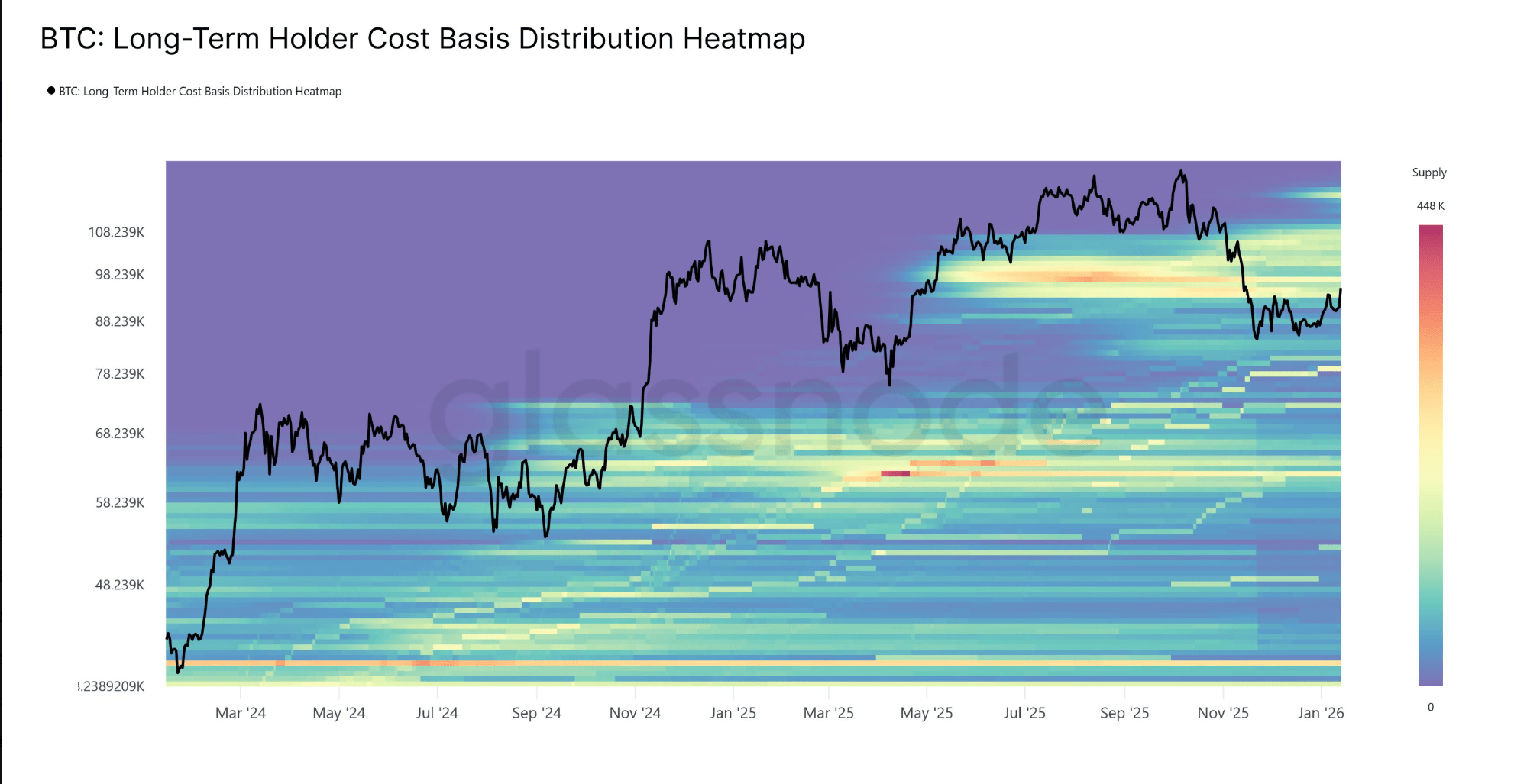 Dies ist ein sehr klassisches On-Chain-Diagramm – Bitcoin Langzeit-Halter Kostenbasis Verteilungsheatmap (BTC: Langfristige Halter Kostenbasis Verteilung Heatmap).