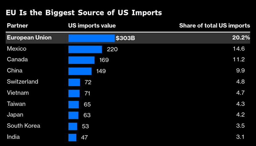 Es ist wichtig, das Ausmaß zu verstehen. Die EU ist die größte Importquelle für die USA. Über 20 % aller amerikanischen Importwaren. Jeder Bruch hier trifft beide Seiten. Laut Schätzungen von Bloomberg Economics könnte bei Zöllen von 25 % der Export betroffener Länder in die USA um bis zu 50 % fallen. Deutschland, Dänemark, Schweden - sie stehen unter maximalem Druck.